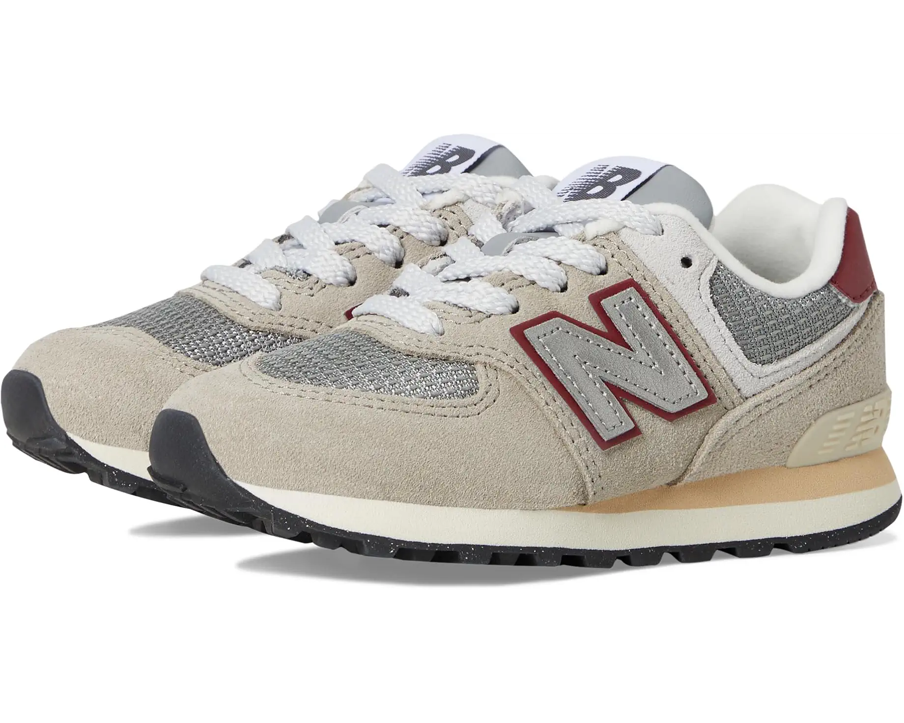- The New Balance® Kids 574 shoes are designed as a reliable, all-purpose sneaker with a durable suede and mesh upper, lightweight EVA foam cushioning in the midsole and heel, and a rubber outsole for traction, offering kids a versatile option suitable for daily wear across school, play, and everyday activities.