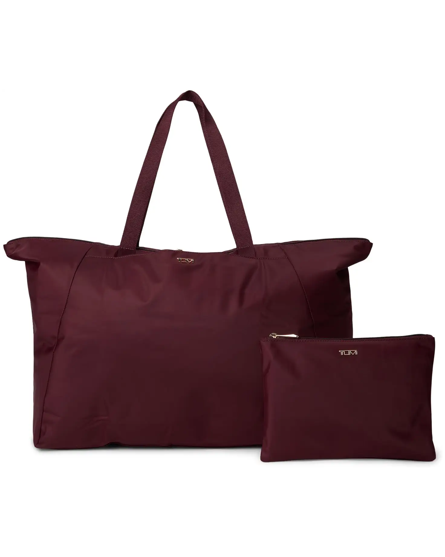 - The Tumi® Just In Case Tote folds flat to be completely packable. Keep it in its small zip pouch that can easily be stored inside larger bags for those moments when you need it "just in case." Its double-zippered top closure offers entry to the main compartment. This lightweight tote has a zippered pouch with snaps that can be attached to the interior bag. Made from nylon, this tote bag has an open pocket at the exterior front for added storage. Its shoulder straps make it convenient to carry around.