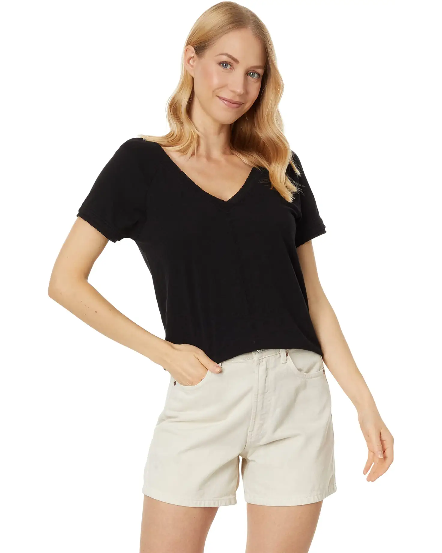 - The bobi™ Los Angeles Rib Mix V-Neck Short Sleeve Tee flaunts an updated design with a vertical yoke lined from the center front to the center back.