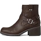 • The Dr. Scholl's® Janis Rugged Short Boots are rugged women's moto boots infused with cool comfort. Their buckle detail adds an instant edge, while the legendary comfort makes them your best walking shoes. These ankle-high boots are made of a fabric lining and a plant-based BLOOM® foam insole with Insole technology offering cushioning, comfort, & support. The faux leather upper is styled with strap details, an iconic buckle accent, and a round toe design. Their lining, topcloth, toe box, and heel counter are partially made from recycled plastic bottles. The zippered side closure ensures easy on and off. Make your fashion statement wearing these heeled boots.