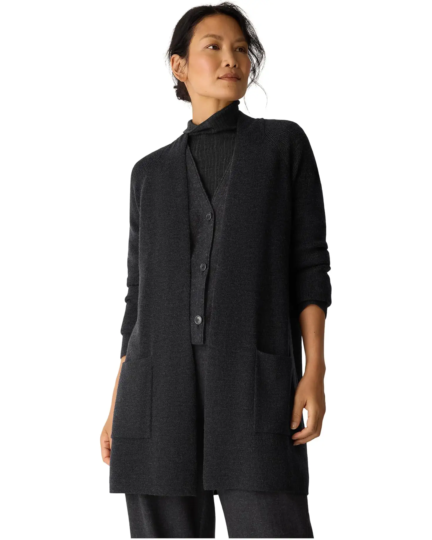 - Effortless layering meets timeless elegance styling the Eileen Fisher® Merino Cardigan. Designed with a classic fit and long sleeves, this wardrobe essential drapes beautifully with its open-front silhouette, making it the perfect piece to slip on for workdays, weekends, and everything in between. Crafted from fine Merino wool, it delivers lightweight warmth and breathability, ensuring all-day comfort in any season. Two patch pockets at the hem add both function and flair, offering a cozy spot for your hands or a chic way to carry small essentials.