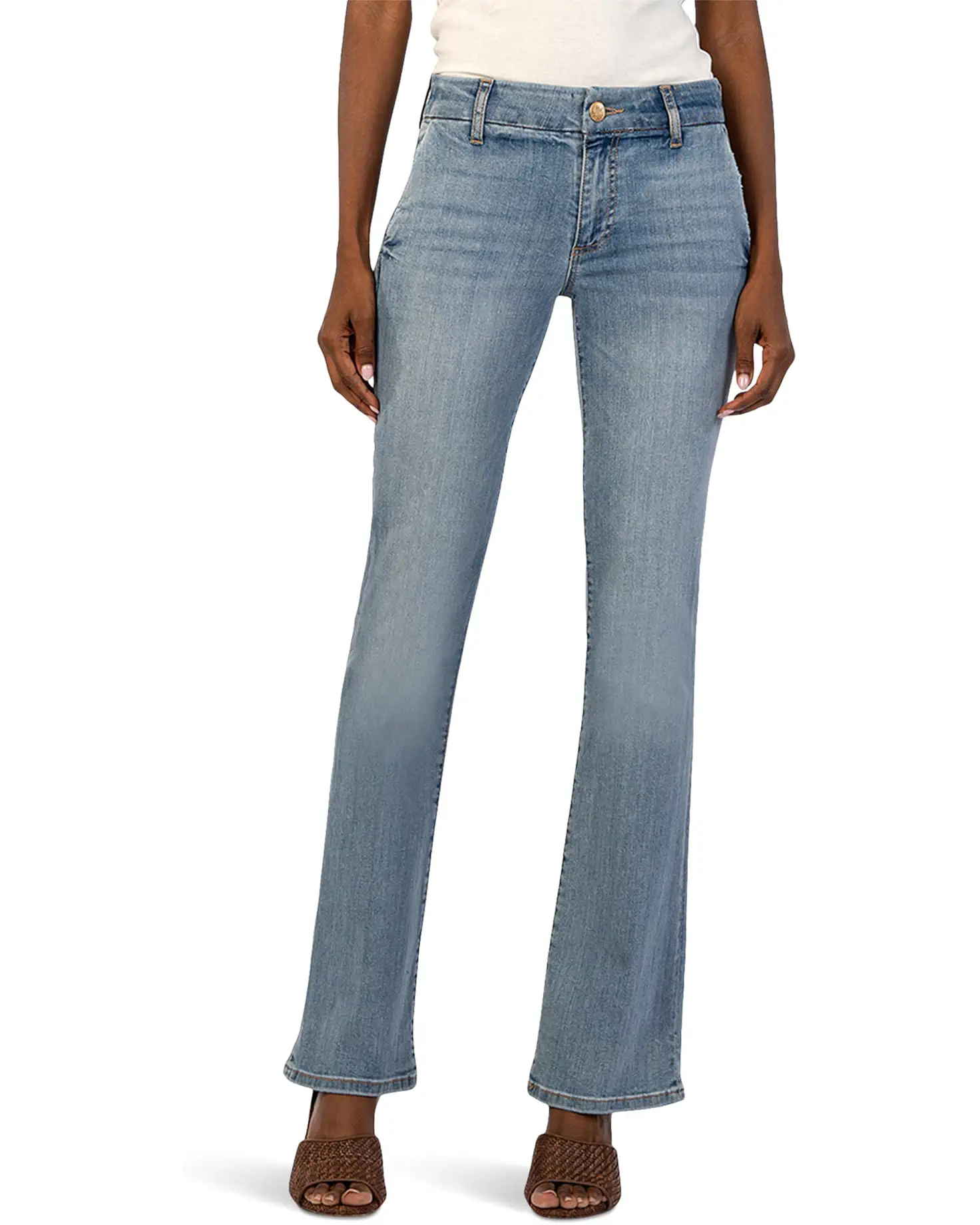 - Be the street swagger in your chic look wearing KUT from the Kloth™ Natalie Mid Rise Trouser Flare Bck Welt In Moment. The bottomwear features belt-loop waist with side on-seam pockets and back welt pockets for additional ease.
