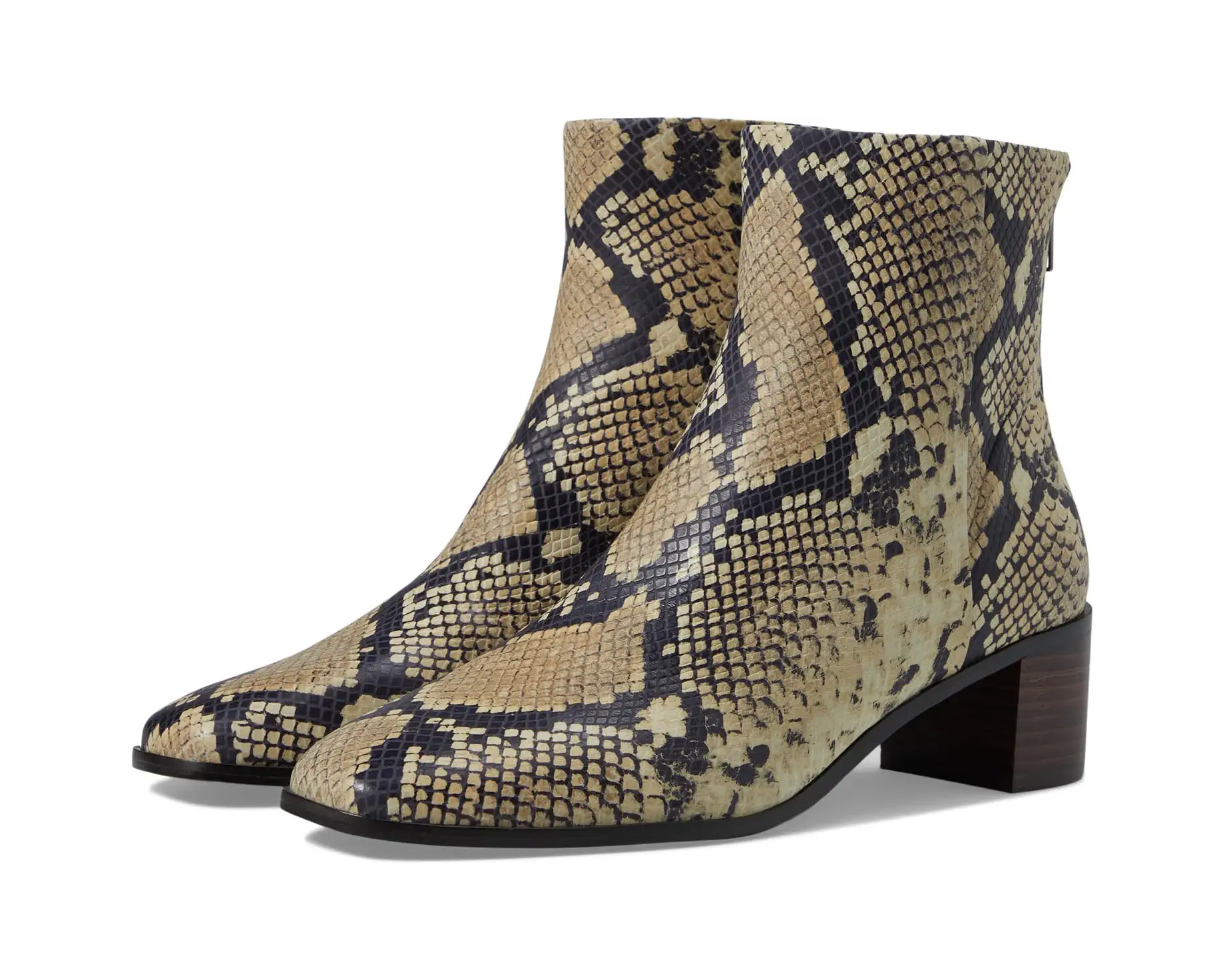 • Exude a stylish vibe as you step outdoors wearing the uber-stylish Madewell® The Essex Ankle Boot in Snakeskin-Stamped Leather Boots. Crafted with a cow leather upper, with an allover snake-skin pattern and a squared toe shape, the boots look extremely chic. These feature a mid-calf length, a back zipper closure, and a solid block heel.