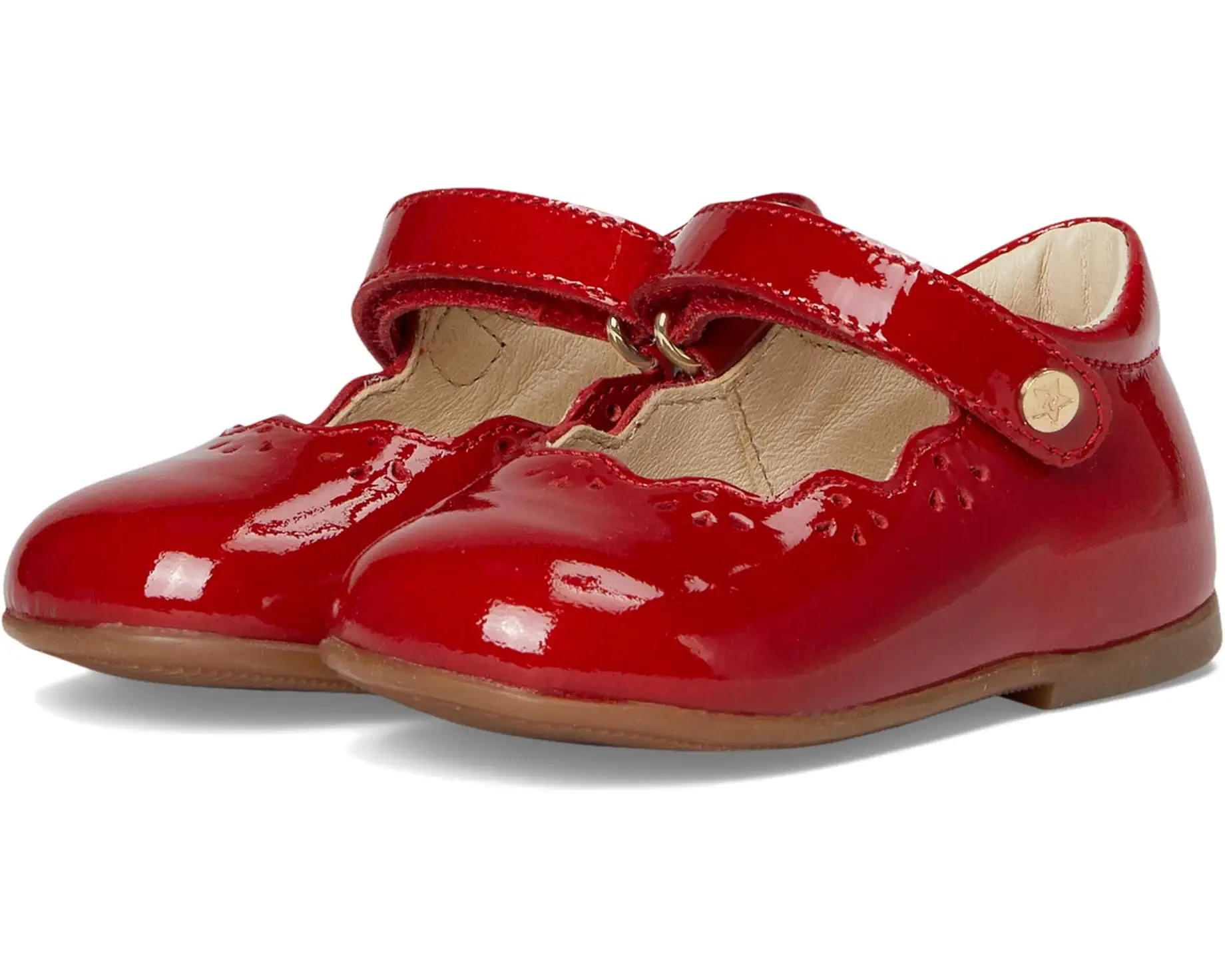 • The Naturino® Naturino Olya are pretty Mary Jane sandals with scalloped edge for your little diva. The round-toe sandals are crafted with a patent leather upper with a hook-and-loop strap, leather lining, and a leather insole.