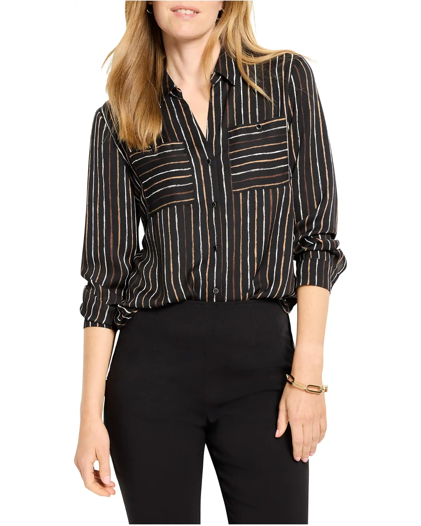 • The NIC+ZOE™ Mini Painted Stripe Shirt offers a new take on a fan favorite from a few seasons back. It comes with a painted stripe print with new colors, perfect for big days at the office, sophisticated going-out looks, or as a casual weekend mainstay. The shirt features a collared neck, button-front closure, long sleeves with buttoned cuffs, two patch pockets on the chest, and a shirttail hem. The reverse striping on the chest pockets breaks up the pattern and shows attention to detail, while the satin chiffon fabric delivers a polished look and all-day comfort.