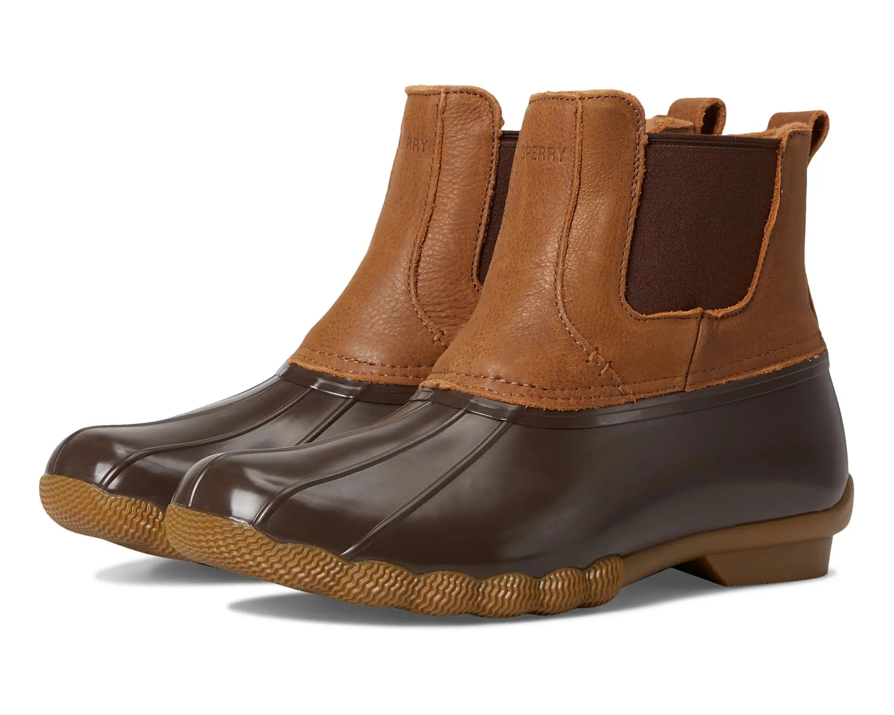 • The Sperry® Saltwater Chelsea boots combine two iconic styles to create a modern boot fit for colder and wetter weather. These boots feature a leather upper, with a rubber duck shell adding a preppy touch. The waterproof upper and thermal lining provide comfort and keep your feet warm and dry, no matter the weather, while a molded Wave-Siping™ rubber outsole offers traction in wet and dry conditions. They are made of a polyester lining and a removable polyester insole. The side gore panels ensure easy wear. These ankle-high boots are perfect to pair with your favorite pair of jeans and dress up for a coffee date or wear around the yard.