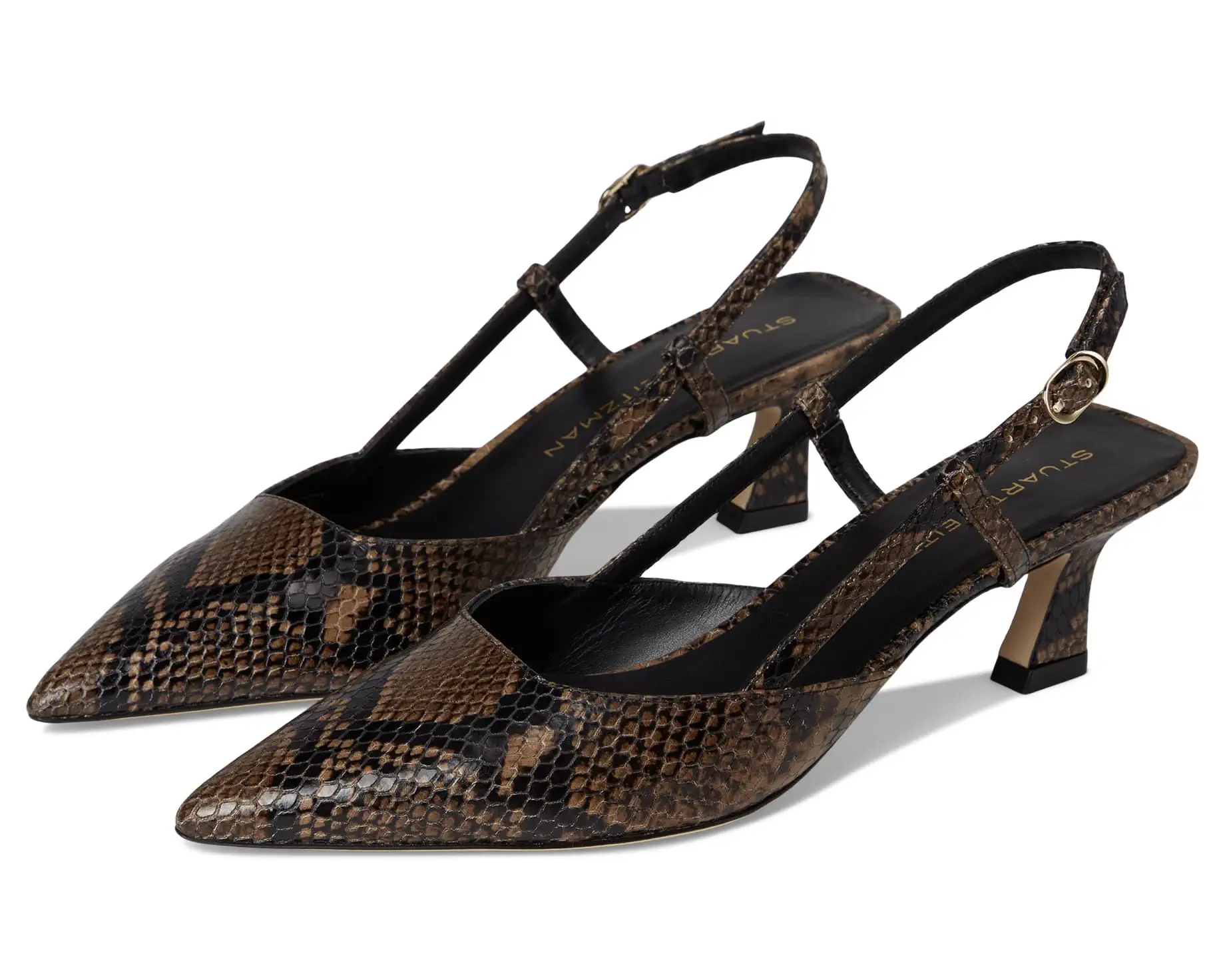 - Embrace luxury and comfort styling Stuart Weitzman® Vinnie 50 Slingback. Crafted from luxurious leather, this chic slingback combines a sleek pointed toe with a stiletto heel for a touch of sophistication and edge. The adjustable buckle closure ensures a secure fit while adding a polished detail. With its sumptuous leather upper, lining, insole, and outsole, this versatile design seamlessly transitions from day to night.