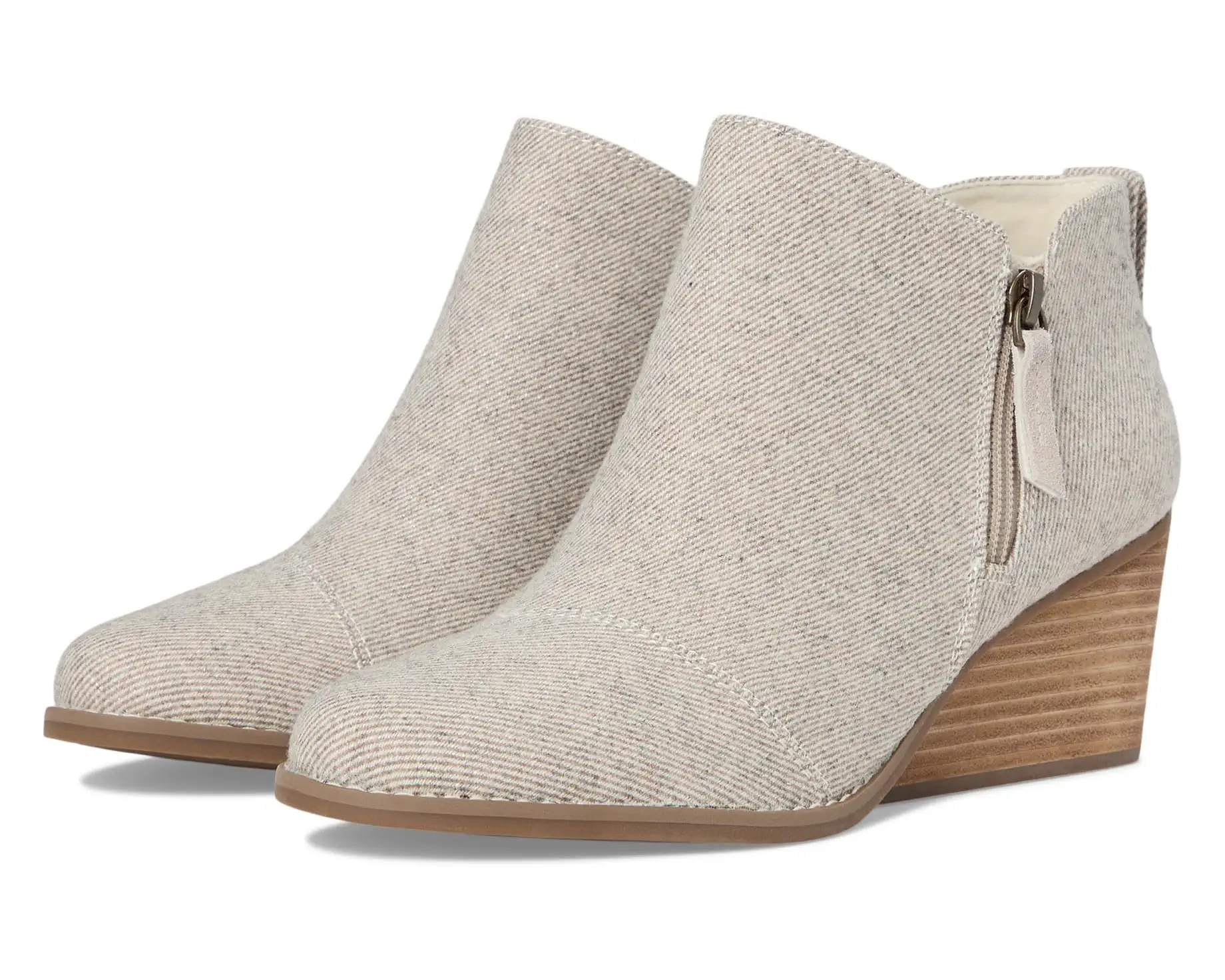 • Sleek and stylish, the TOMS® Goldie wedge bootie blends comfort with a refined silhouette. Crafted with durable leather upper, this bootie features a sculpted wedge heel for a subtle lift. The lateral zipper and rear pull tab ensure easy on-and-off wear, while the Custom CloudBound™ foam insole provides all-day cushioning and support.